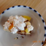 フルーツなどトッピングされたロールケーキに生クリームで飾りつけをしていきます。