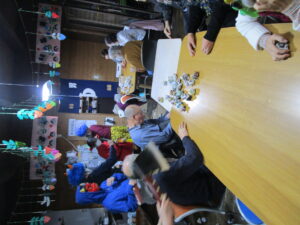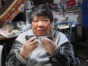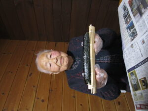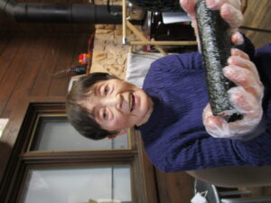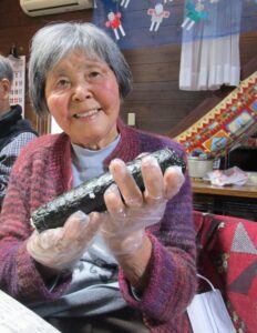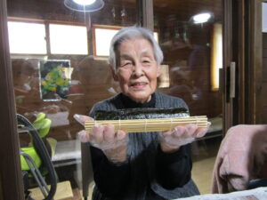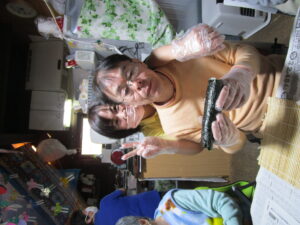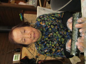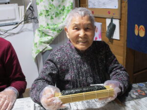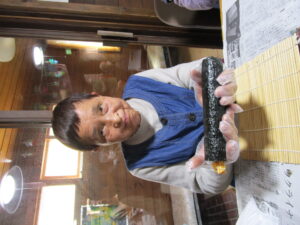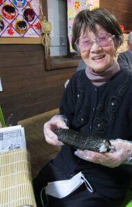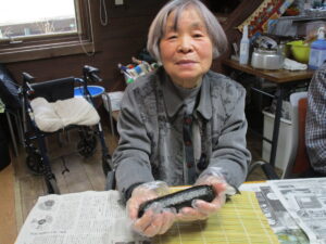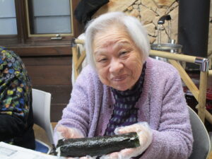 まずは恵方巻作りです。皆さん自分が食べる用の恵方巻を作って頂きました。具材はシイタケ・かんぴょう・きゅうり・かにかま等自分で入れたい具材を選びながらご飯の上に乗せていきます。気が付くと溢れんばかりのシイタケが乗っかている利用者様もいました(笑)
