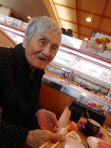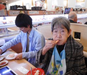 新幹線が運んでくれるお寿司に目を丸くするHさん。