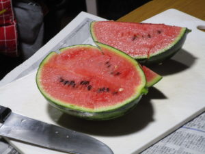 利用者様の熱い視線を感じながら、スイカを切ってみると・・・赤い!!(内心やった~!)
