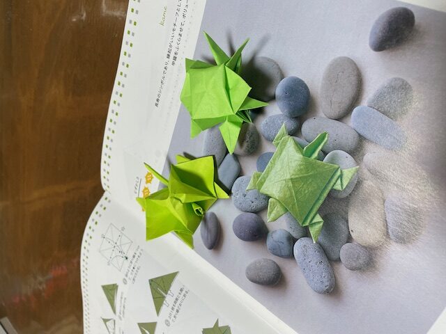訪問先で折り紙の本からAさんは「これが折りたい!」と難易度3(この本ではMax難易度・・・)を選ばれまして・・・ 私は折り紙が苦手なので懸命に取り組み、出来上がったらないはずの羽が生えてました・・・ Aさんは「ガ〇ラだね!飛ぶかな?」と喜んで投げてました! 中央の本にあるカメにはなりませんでしたが、喜んでもらってよかったです! 創造の翼を羽ばたかせていくのもいいですね。 OZ