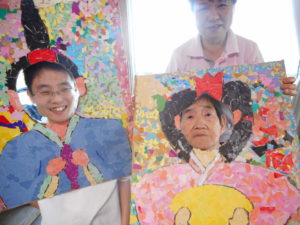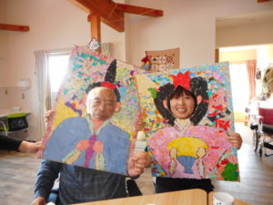 おやつを食べた後は、恒例の「お内裏様・お雛様の顔出しパネル」で楽しみました。