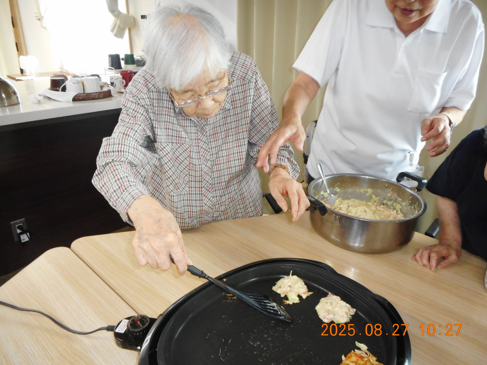 お好み焼きの生地ができると、利用者様全員でホットプレートを囲み、一人ひとりスプーンで生地をのせて焼きました。上手に焼けたかな、、、?