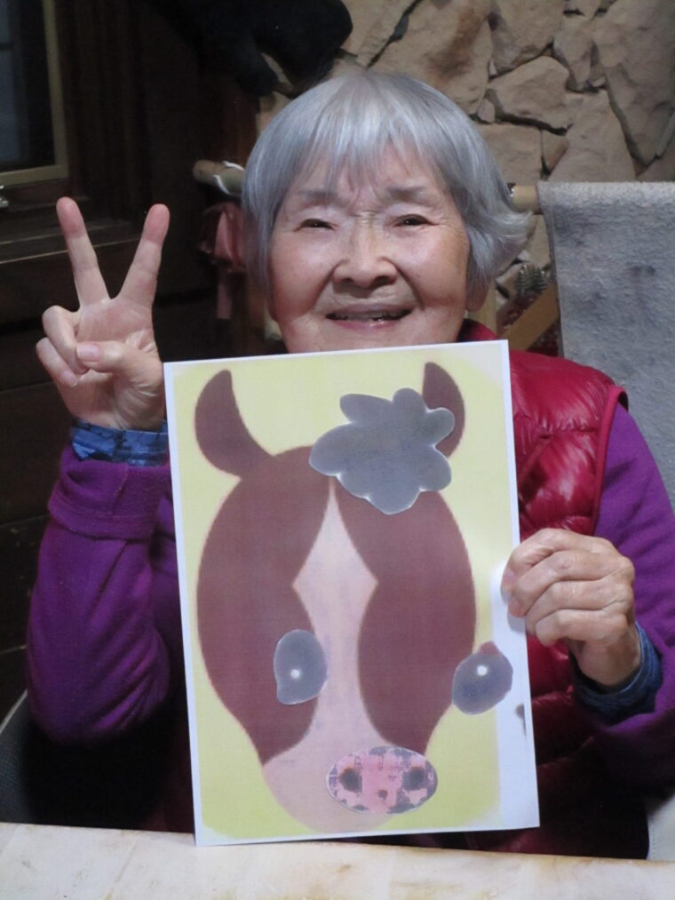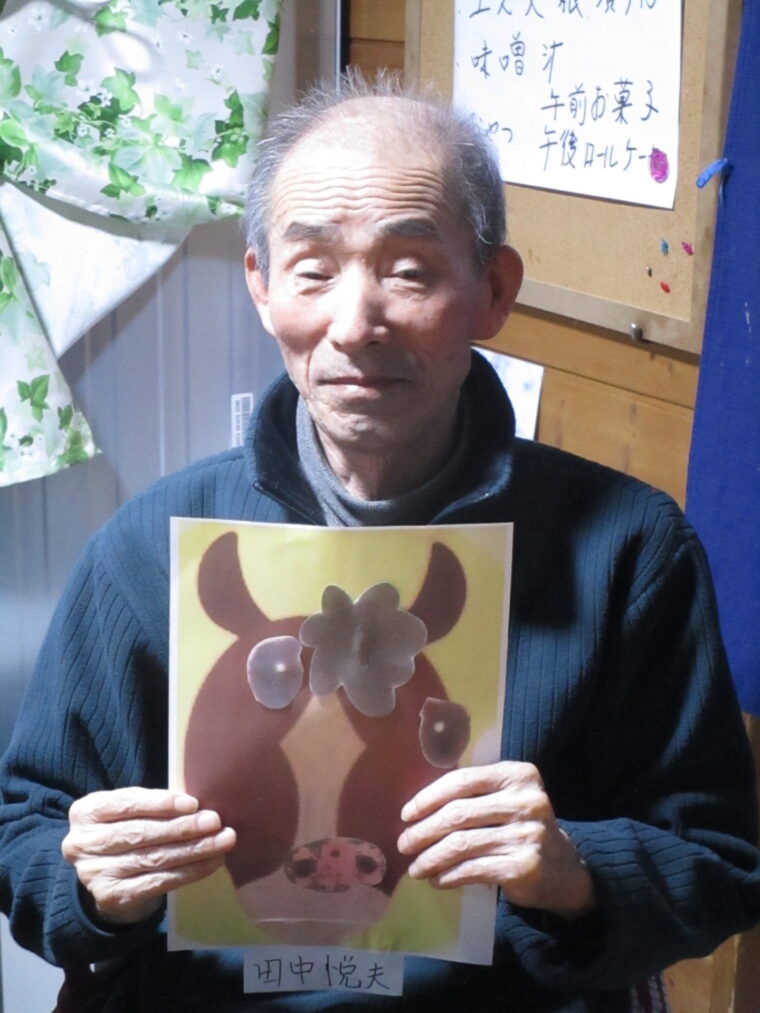 そして利用者さんから一文字ずつ習字をしていただき「あけましておめでとうございます」を貼りました。