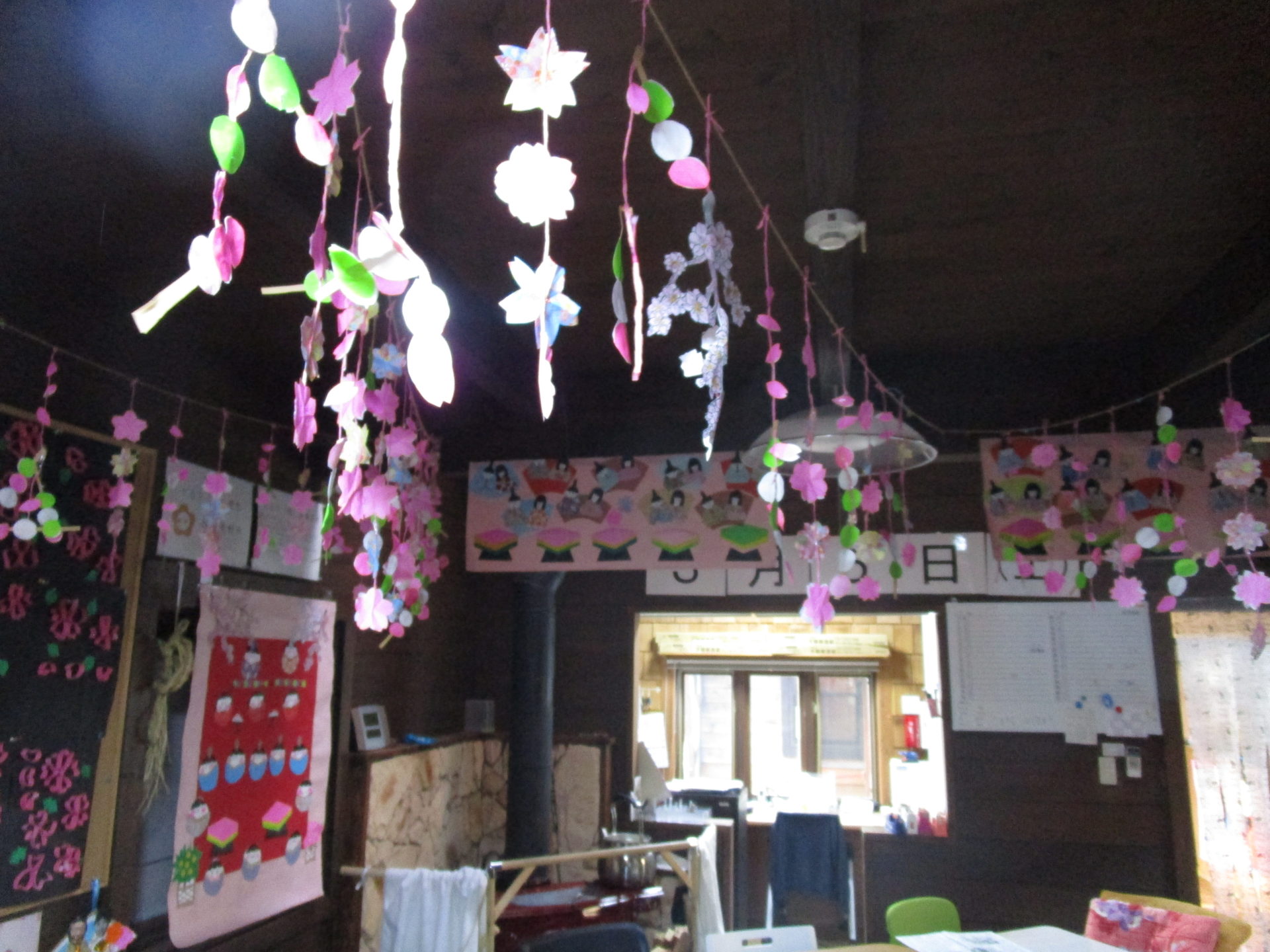 ホールには、利用者さんがおひな様に扮した写真やつるし飾りなど所狭しと飾られて