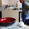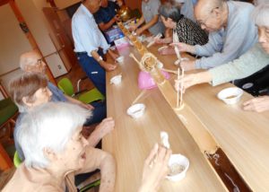 室内のテーブルにセットされた竹の水路に利用者さんも感心!!