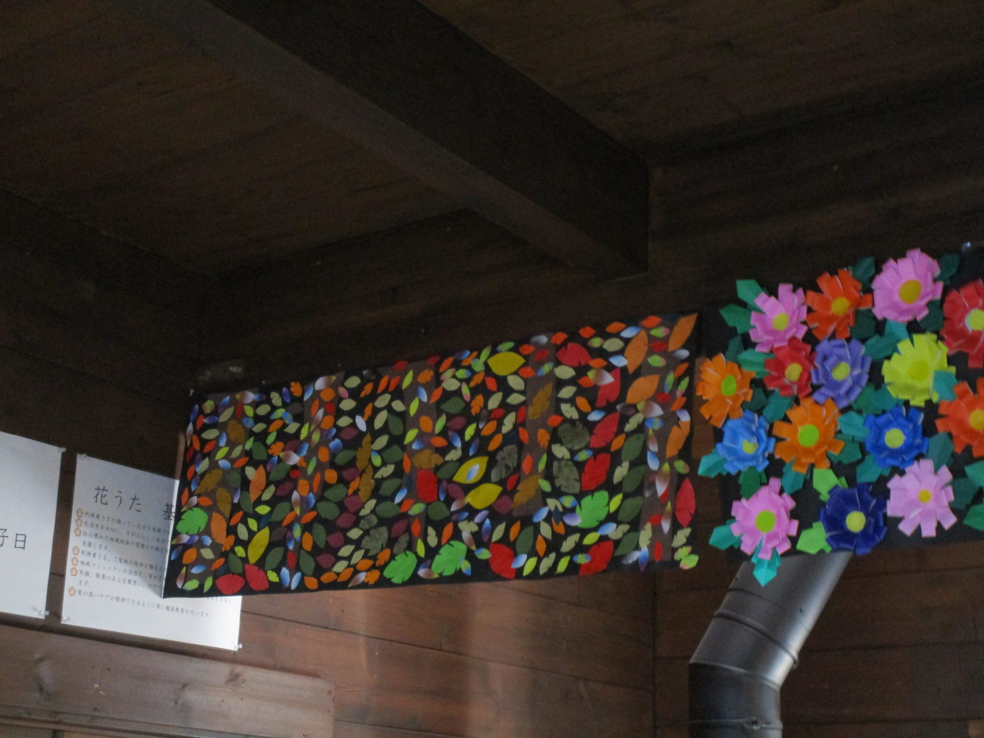 季節を感じながら落ち葉のイメージの貼り絵にして壁に貼り楽しみました。