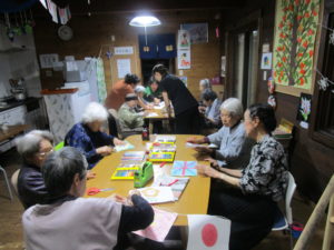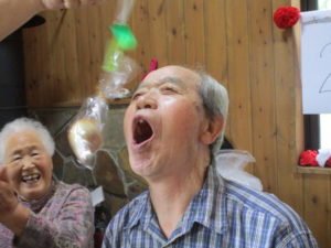 立ち上がって投げる人、スタート前に入れる人など反則もみられましたが、利用者さんが作った紅白の球を夢中で投げました。