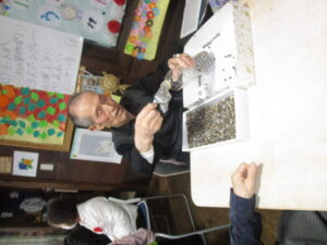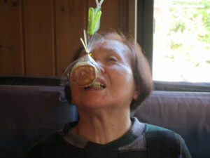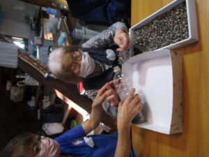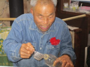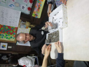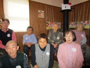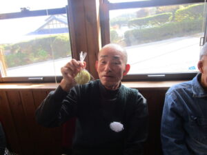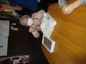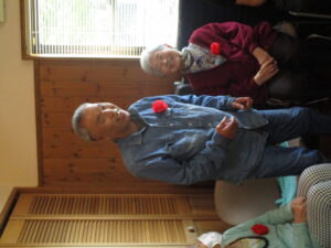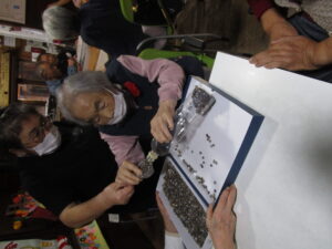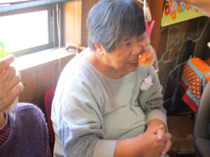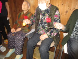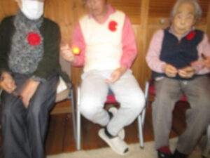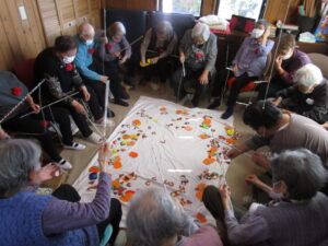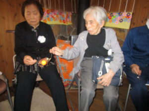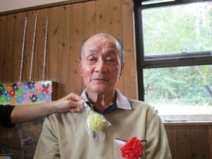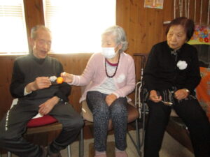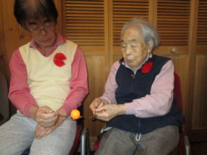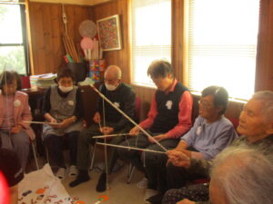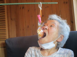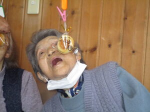 秋の果物釣りでは、日々のレクレーションで作った、折り紙の柿や栗を手作りの釣り竿で釣りました。