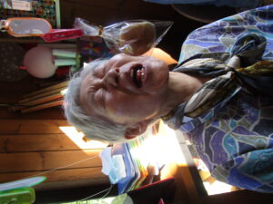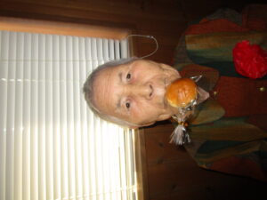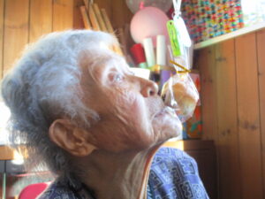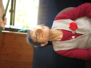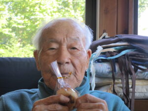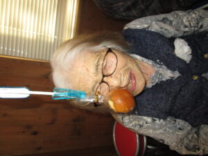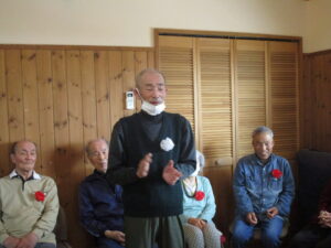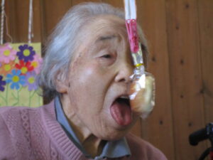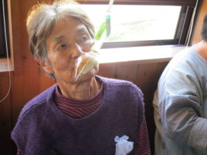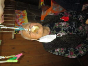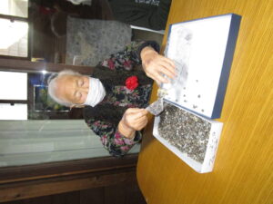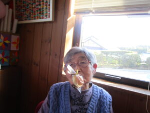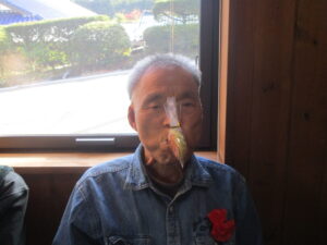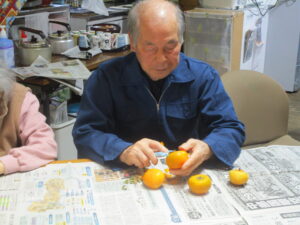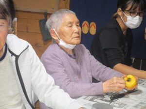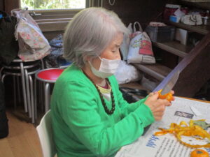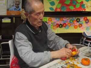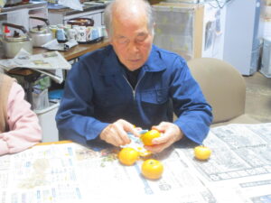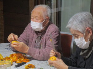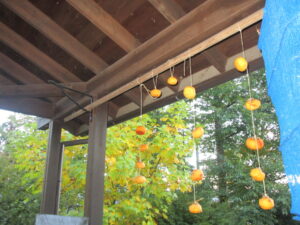 花うたでは渋柿の皮を利用者様に剝いて紐につなげて訪問看護ここ花の入口に干し始めました。