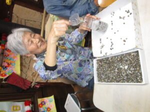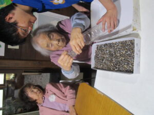 満石リレーは、小さい石をスプーンですくってペットボトルにどれだけ入るか競うゲームです。