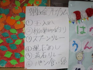 種目は①玉入れ ②秋の果物釣り ③スプーンリレー ④運試し ⑤満石リレー ⑥パン食いの全6種目で行いました。